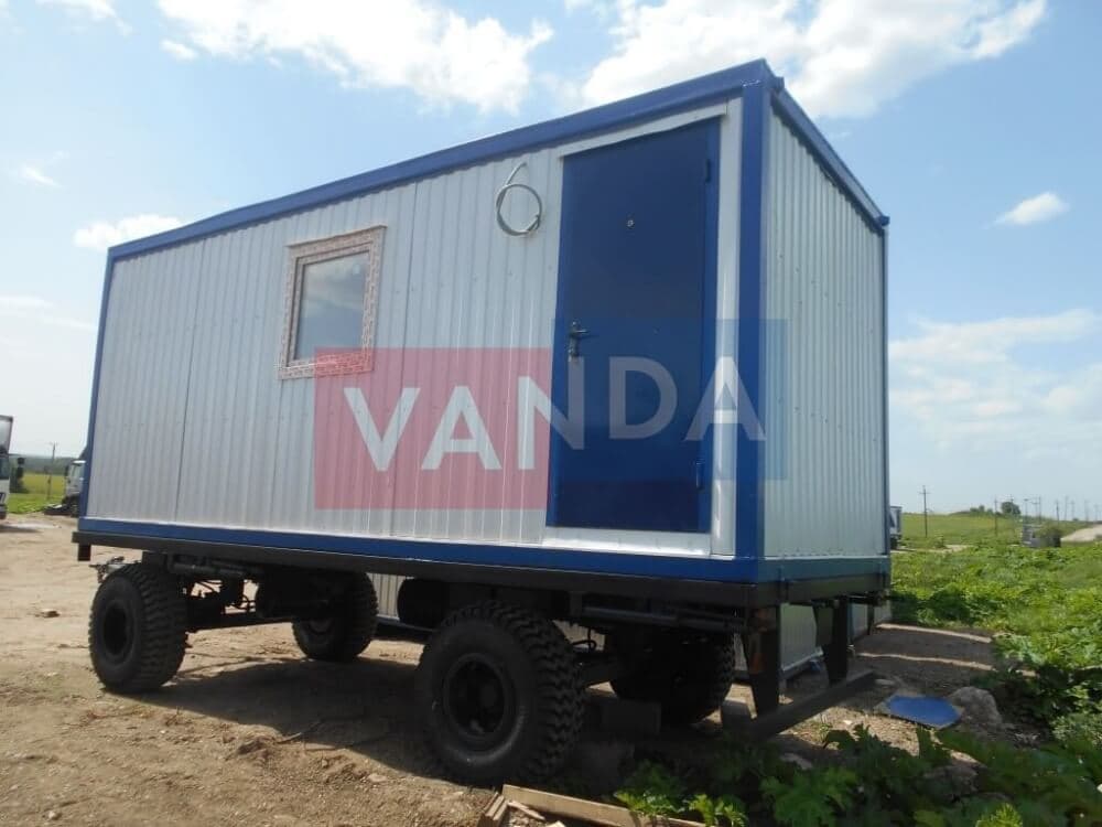 Контейнер на колесах состоит из металлического каркаса, который выполнен из профиля и укреплен сварным швом. Крыша покрыта листовым холоднокатанным окрашенным сварным металлом. Внешняя сторона стен обшита оцинкованным профнастилом. Внутренний каркас вагончика изготовлен из бруса. По всему периметру помещение утеплено и пароизолировано. Внутренняя отделка осуществляется по выбору заказчика. Это может быть вагонка или оргалитовые листы. Пол вагончика состоит из обрезной доски, пароизоляции, утепления поверх которого уложены ДСП. Вагончик оборудован дверью из оргалита и деревянными окнами с двойным остеклением.